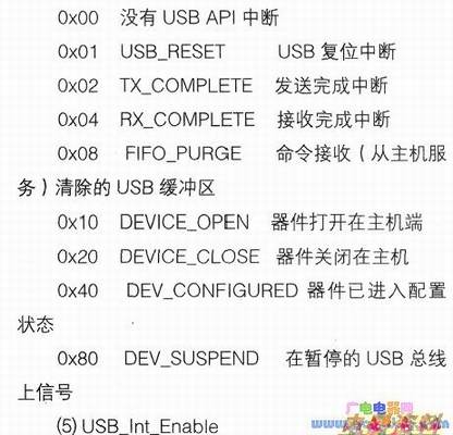 功能:允许USBAPI中断。调用USB_lnt_Enable函数后,下述API事件均可产生USBAPI中断。