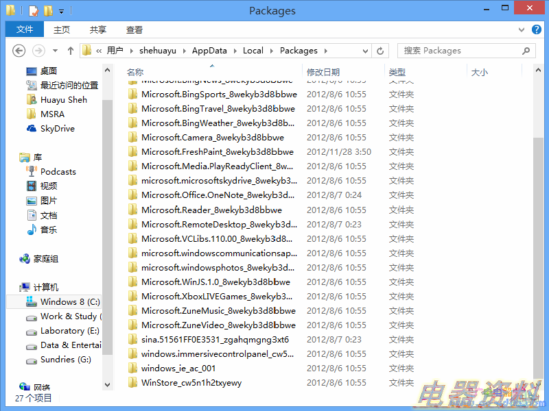 从图中可以看出,识别这些 App 究竟对应开始屏幕里面哪个 Modern App 其实并不难,因为文件夹的部分就是该程序的名称。例如我们可以看见最后一个,"WinStore_cw5n1h2txyewy",它无疑就是"应用商店"这个应用的内部名称。