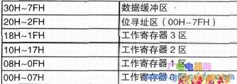 用户RAM区,包括堆栈区和用户标志区等用户自己设定的数据区。其地址在内部RAM低128单元中。如果用户的程序要使用四组工作寄存器,其单元地址为30H~7FH,共80个单元,如果用户程序不需要四组工作寄存器,则其中一部分工作寄存器区也可作用户RAM使用。用户RAM区中的堆栈,用来暂存数据和地址,它是按“先进后出”