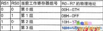 工作寄存器区有四组工作寄存器,每组8个寄存器,用于存放操作数及中间结果等。其地址为内部RAM的00H~1FH单元地址。在任一时刻,CPU只能使用其中一组寄存器,并把正在使用的那组寄存器称为当前寄存器组,用R0~R7表示。当前使用的到底是哪一组工作寄存器,则由程序状态字寄存器PSW得RS1、RSO位的状态组合决定,下表为工作寄存器选择。