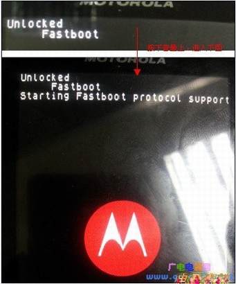 3.手机完全关机,按音量下键和开机键,直至出现fastboot字样,松手,接着按音量上键,看到屏幕上方变成第二行出现Starting Fastboot protocol support字样