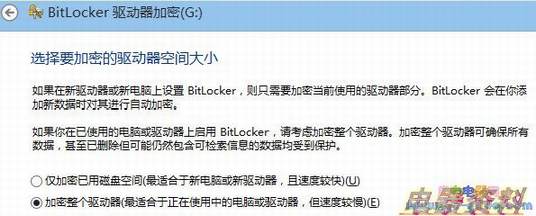 接着我们选取是否仅加密使用过的部分或者加密整块磁盘,在这里Windows 8已经将两个选项解释的很清楚了,我们按照自己的需求选择一种,其中仅加密已使用部分是Windows 8的新功能,可以使加密过程快速很多: