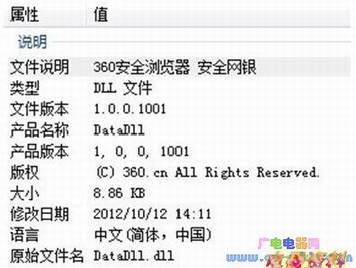 将该文件从数据流中提取出来得到一个dll文件,查看该文件的属性,得到其文件说明为“360安全浏览器 安全网银”。