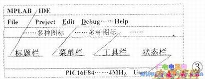MPLAB的所有功能,都可以通过MPLAB桌面中的菜单命令进行需要功能的操作。入门学习PIC单片机汇编源程序时,应先熟练掌握图3菜单栏中File(文件)和Project(项目)的功能使用方法。之后再扩展到其它菜单功能的使用,这样可以大大地节约学习的时间。