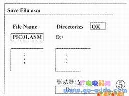 2.存盘PIC单片机源程序.ASM并自定义文件名 当在上述空白窗口中已建立了源程序时,用鼠标再次打开MPLAB桌面菜单栏File的下拉菜单,点击下拉菜单中的Save命令,即可打开图5所示的对话框,对话框左上角的标题名为Save File As(存盘文件)。在此对话框右边的驱动器Drives和目录(Directories)栏中,用鼠标选择已建源程序的盘符路径,如D:\,或E:\,或带自定义文件夹;在此对话框的左边File Name(文件名)的对话框中与鼠标配合,用键盘输入自定文件名和定义的扩展名.ASM,如PIC01.ASM。到此,再用鼠标点击对话框右上角的OK命令(有的是“确认”二字),即可把已建立的PIC单片机源程序以指定的盘符路径和文件名,存人到MPLAB指定的目录中。