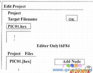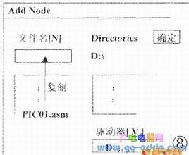 3.创建源程序项目.Pjt、编辑和加载 用鼠标点击MPLAB桌面上从左开始的第二菜单Project,即可打开Project的下拉菜单。在其下拉菜单中,再点击New Project命令,即可打开如图6所示的对话框。对话框左上角的标题名为Newproject。在此对话框的右边,同上述一样,用鼠标选择已建源程序其驱动器Drives相同的盘符路径;在此对话框左边文件名File Nam的对话框中,用键盘输入主文件名和项目扩展名.PJT,如PIC0l.Pjt。之后再点击OK命令,则在显示器上立刻出现一个新的如图7所示的对话框。该对话框左上角标题名为Edit Project(编辑项目)观察图7对话框时,可看出在Target Filename(目标码文件名)对话窗口中,已装有需要汇编源程序目标码的文件名PICOl.hex。这里的主文件名仍为自定义的PIC01,扩展名为.hex。在此对话框的左下方的project Files(项目文件)对话窗口中,已装有PIC002[hex]。到此,只需用鼠标点击对话框右下的Add Node…命令,立刻在显示器上又出现如图8的新对话框,对话框左上角的标题为Add Node。在此对话框文件名[N]之下的大窗口中,用鼠标找出你要汇编的源程序文件名PIC01.ASM,再用鼠标点击。PIC01.ASM,则该文件名即可复制到文件名[N]的小对话框中。