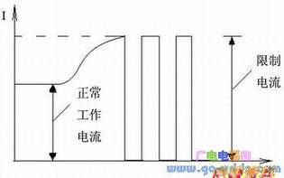 图2是一种带过流保护的负载开关结构框图,图2中,RL是负载,RS是电流检测电阻.流过RS的电压降VRS与电流I成比例,此电压VRS输入负载开关VI端.若内部电流检测电路检测出有过流状态,输出过流信号(信号)给通、断控制电路,关断负载开关.一旦开关断开,RS上电压VRS=0,开关又接通,产生振荡,如图3所示.输出电流将小于限制电流.更好的办法是通过FLAG端输出过流信号给μC,使μC输出低电平给负载开关ON端,关断负载开关.图2中未画出μC及μC与负载开关的连线.