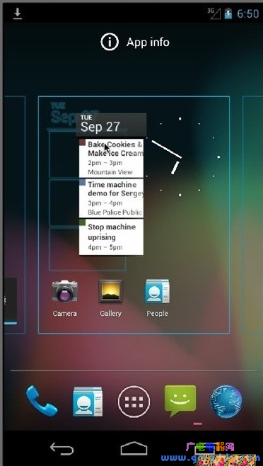 Android:Android系统的应用列表也一直没什么改变,但是幸好,Android的主界面上可以安放各种各样的插件,用户可以按照自己的喜好随意摆放,只要应用得当,用户几乎在主界面上完成所有的信息获得和反馈。在果冻豆中,Google在主界面上加入了图标自动排列功能,可以更好地利用桌面空间。