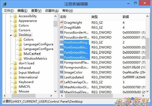 2. 前往注册表 HKCU\Control Panel\Desktop, 在下面,找到四个以 FontSmoothing 开头的键值,分别设置为 2,0,1,2 即可。