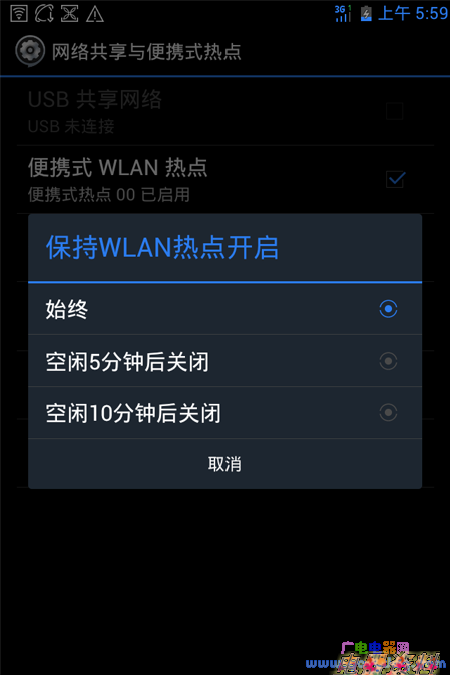 要提醒大家一点的是,如果你一直需要使用手机的便携式热点上网的话,还需要在“网络共享与便携式热点”下一级中的“保持WLAN热点开启”中设置“始终”,如果是设置成5分钟或者10分钟的话,在这个时间段之后热点会自己关闭。