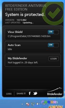 近年来随着越来越多的杀毒软件都推出了免费版本,Bitdefender也终于推出了免费版本,并完美支持Win8。BitDefender 的设计非常简洁。对于一些不太熟悉使用电脑的用户,BitDefender 的几乎零配置可谓非常方便,因为它只有两个总开关“Virus Shi”(病毒防护盾) 、“Auto S”(自动扫描) 和一个登录按钮,而且也没有广告。初次使用Bitdefender需要注册账号,否则只能试用30天。