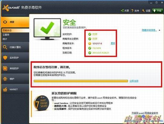 但是第一次使用avast!时需要用户进行简单的注册,注册之后就可以获得一年的使用期,到期之后再次注册即可。需要注意的是在注册成功之后记得要选择继续使用基础的防护,不要选择试用网络安全软件,因为试用期只有20天。