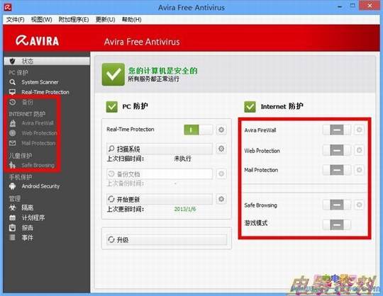 当你第一眼看到小红伞的界面的时候,是不是感觉这软件的界面很简陋,就好像回到了十年前的感觉?其实这些完全符合德国人的一贯作风:简单、实用、不浮华,软件还是相当给力的!当然,由于是免费版本的缘故,互联网防护和儿童保护等功能是无法使用的,选项都是灰色的。需要注意的是免费版本的小红伞是有广告的。