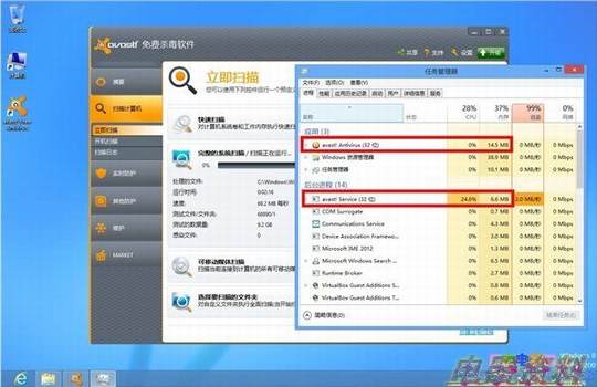 除了查杀率,相信用户最关心的就是杀毒软件对系统资源的占用了,下面我们就来看下这四款软件的资源占用情况。四款软件在扫描时,avast!的内存占用是最低的,只有20M多一点,;而AVG的内存占用也只是比avast!略高一点,不到50M。相比之下小红伞的内