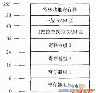我们通常把程序烧制到芯片的ROM内;而RAM是用来存放一些临时的待处理数据;内部数据存贮器有256个字节的存贮空间,其结构如下图所示,这256个字节当中含4个寄存器组,每组都有R0-R7八个寄存器;其余的空间在程序设计的时候都直接用它们的地址来代表它,例如RAM的第32个字节,在程序中就用20H来代表;至于串行口、外中断和定时器,根据需要,可用可不用。