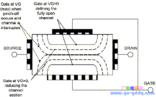 JFET的基本想法(图1)是通过调节(夹断)漏-源沟道之间的截面积来控制流过从源极到漏极的电流.利用偏置的结作为栅极可以实现这一点;其(反相)电压调节耗尽区,结果夹断沟道,并通过减少其截面积来提高它的电阻.由于栅极没有施加电压,沟道的电阻数值最低,并且流过器件的漏极电流最大.随着栅极电压的增加,两个耗尽区的开头前进,通过提高沟道电阻降低了漏极电流,直到两个耗尽区的开头相遇时才会出现总的夹断.