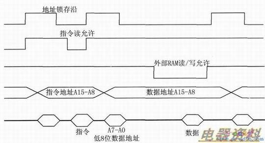 根据单片机外部操作时序,ALE为地址锁存使能信号,可利用其下降沿将低8位地址锁存于CPLD/FPGA中的地址锁存器(LATCH_ADDRES)中;当ALE将低8位地址通过P0锁存的同时,高8位地址已稳定建立于P2口,单片机利用读指令允许信号PSEN的低从外部ROM中将指令从PO口读入,其指令读入的时机是在PSEN的上升沿之前。