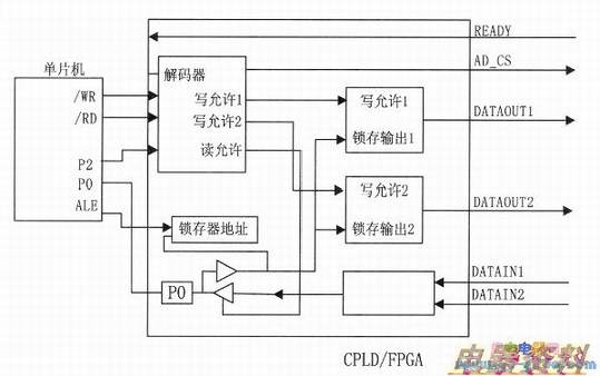 在CPLD/FPGA中通过逻辑切换,单片机易于与SRAM或ROM接口。这种方式有许多优势,如利用类似于系统的的工作方式,首先由CPLD/FPGA与接口的高速等器件进行高速数据采样,并将数据暂存于SRAM中,采样结束后,通过切换,使单片机与SRAM以总线方式进行数据通信,以便发挥单片机强大的数据处理能力。