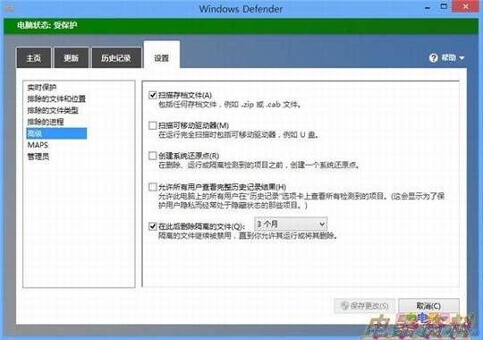在设置页面中,我们可以看到实时保护、排除的文件和位置、排除的进程、高级等选项,设置不算很丰富,但是作为一款系统自带的免费杀毒软件,也能基本满足基础用户的需求。