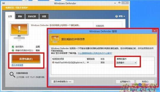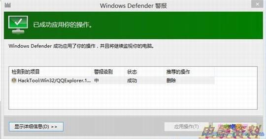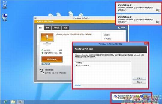 当Windows Defender检测到系统存在病毒文件时,会如下图中所示在桌面的右上角弹出“已检测到恶意文件”的提示框,同时伴有提示音。并且在右下角以气泡的形式提示你检测到可能有害的软件,当单击气泡时,Windows Defender还会对检测到的有害软件进行复查,并执行相应的操作。对于某些样本,Windows Defender还会提示你进行样本上报。