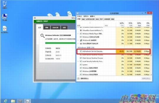 接下来就看一下Windows Defender在扫描时的资源占用吧。由于测试时是在虚拟机中进行的,所以CPU的占用率可以直接无视,主要看一下内存的占用率,扫描时的平均内存占用只有60M左右,内存控制相当不错。