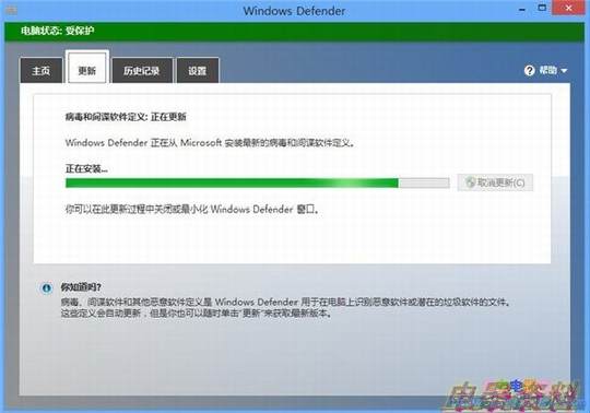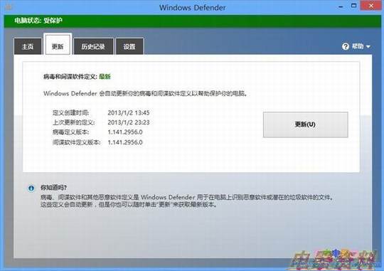 Windows Defender的更新完全不用我们去费心,它的更新是和WindowsUpdate在一起的,每当有了新的病毒定义时,系统就会自动为软件更新。当然,像我这样的轻微强迫症“患者”总会想手动的去看一下到底有没有新的病毒定义可用。