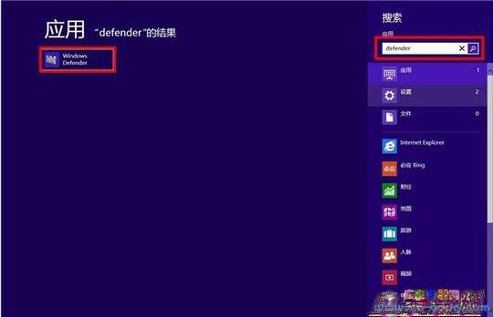 第二种:同时按下Win+Q键,在搜索框中输入Defender,就可以在左边的结果中看到Windows Defender了。