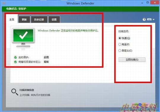 打开Windows Defender之后我们会发现它的界面十分的简介,一个显示器模样的图标显示着软件现在的状态,如果是对勾的话证明Windows Defender正在保护着您的系统,下面显示着实时保护的状态以及病毒和间谍软件定义的版本。在窗口的右边,有快速、完全、自定义三个扫描选项。