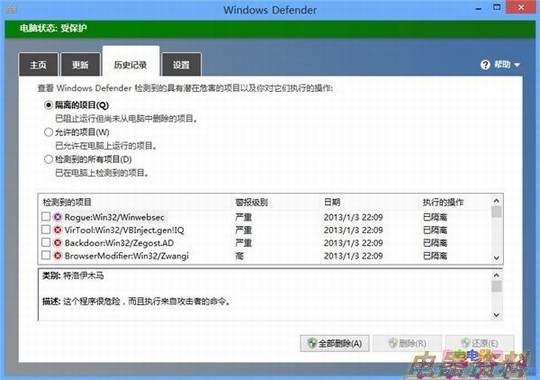 在历史记录页面中,我们可以清楚的看到有哪些文件被检测出有病毒,并且被执行了那些操作,Windows Defender还很人性化的为这些染毒文件根据警报级别进行了分级。