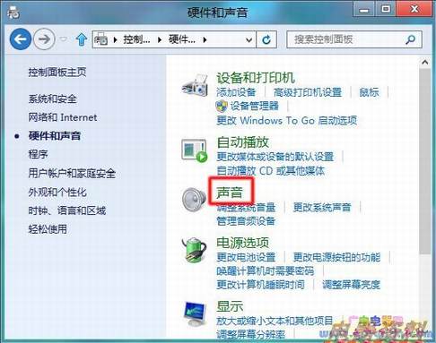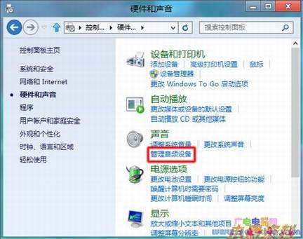 点击“硬件和声音” ,然后在“声音” 下,点击“管理音频设备” 。