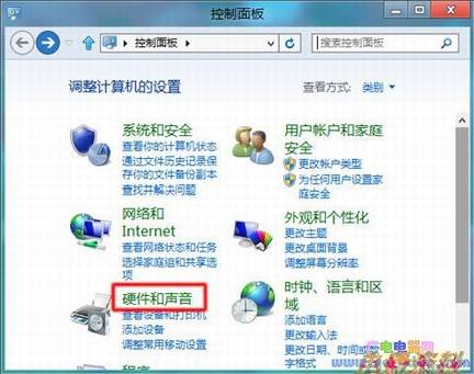 2.点击“硬件和声音” ,然后在“声音” 下,点击“管理音频设备” 。