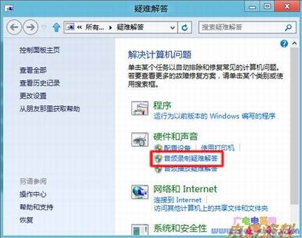 3.在 硬件和声音 下,点击 音频录制疑难解答 ,当录制音频窗口打开时,点击“下一步” 。