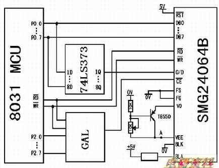 SMG24064B应用时,可以采用总线方式或者模拟口线方式。双缓冲方式只能采用总线方式,通过端口译码来实现。下图是一种典型的接口电路。图中的GAL实现地址译码,当然也可以采用74138等完成译码。译码输出信号连接到T6963C控制器的片选使能端CE,而数据命令选择端C/D可以接地址线A0。