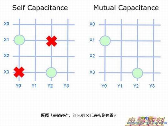 在自电容屏幕中,每一根X或者Y线都是一个电容传感器。显然,自电容传感器要比互电容的大。大传感器可以创建强大的信号,使得设备可 以检测到在屏幕上方20mm处的手指。当有手指停留在屏幕上或者屏幕上方时,距离手指最近的传感器线会被激活(X1,Y0)。如果检测到两根手指,便会有四根线被激活,鬼影效应出现。正如上图显示的,当检测到两根手指时,会出现四个可能的触碰点(X1,Y0)、(X1,Y2)、(X3,Y0)以及 (X3,Y2),而正确的组合又是不明确的,进而不能实现多点触控。