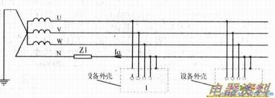如下图,正常情况下,因保护线PE没有电流.外壳与中性点无电压降,所有设备的外壳对地电压为零,属最安全的保护系统。