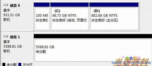 用于组建软RAID的磁盘容量不一定相同,接口也可以不同。在“计算机”管理菜单中选中“磁盘管理”选项,打开后可以看到未分区的两块3TB磁盘,在其中任一磁盘上右键单击均可出现“新建带区卷/镜像卷/跨区卷/转换动态磁盘”等选项。首先转换为动态磁盘,然后选择“新建带区卷”,它的功能就相当于硬RAID 0。随后再设置新建的两个带区卷各自的容量,就可以完成软RAID的组建了。
