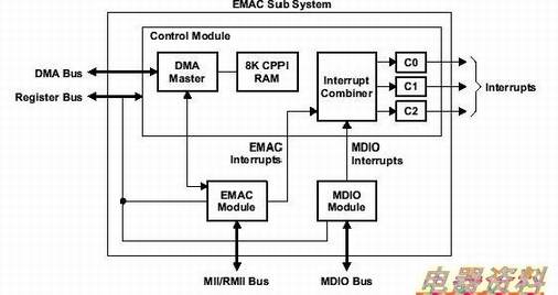 EMAC 控制模块不但可控制设备中断,而且还整合了一个用于保持 EMAC 缓存器描述符的 8K 字节内部随机访问存储器 (RAM)。该 MDIO 模块采用 802.3 串行管理接口来询问和控制多达 32 个采用共享双线总线连接至设备的以太网 PHY。