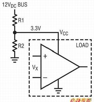 图1 电阻分压器采用12V总线输入产生3.3VDC
