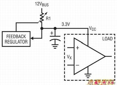 我们从一个简单的例子开始。在嵌入式系统中,可从前端电源提供一个12V总轨。在系统板上,需要一个3.3V电压为一个运算放大器(运放)供电。产生3.3V电压最简单的方法是使用一个从12V总线引出的分压器,如图1所示。这种做法效果好吗?回答常常是“否”.在不同的工作条件下,运放的V引脚可能会发生变化。假如采用一个固定的分压器,则 VCC电压将随而改变。此外,12V总线输入还有可能未得到良好的调节。在同一个系统中,也许有很多其他的负载共享12V电压轨。由于总线的原因,12V总线电压会随着总线负载情况的变化而改变。因此,分压器不能为运放提供一个用于确保其正确操作的3.3V稳定电压。于是,需要一个专用的电压调节环路。如图2所示,反馈环路必需调整顶端电阻器R1的阻值以动态地调节VCC上的3.3V.