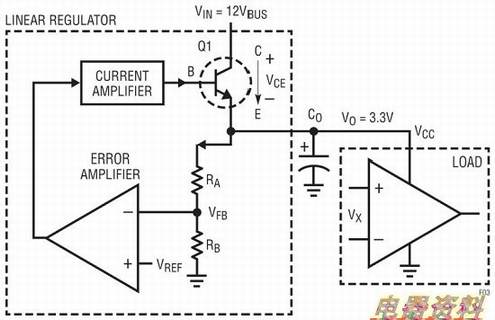 此类可变电阻器可利用一个线性稳压器来实现,如图3所示。线性稳压器使一个双极性或场效应功率晶体管(FET)在其线性模式中运作。这样,晶体管起的作用就是一个与输出负载相串联的可变电阻器。从概念上说,如需构建反馈环路,可由一个误差放大器利用一个采样电阻器网络(RA和RB)来检测DC输出电压,然后将反馈电压VFB与一个基准电压VREF进行比较。误差放大器输出电压通过一个电流放大器驱动串联功率晶体管的基极。当输入VBUS电压下降或负载电流增大时,VCC输出电压下降。反馈电压VFB也将下降。因此,反馈误差放大器和电流放大器产生更多的电流并输入晶体管Q1的基极。这将减小电压降VCE,因而使VCC输出电压恢复,这样一来VFB=VREF.另一方面,如果VCC输出电压上升,则负反馈采取相似的方式增加VCE以确保3.3V输出的准确调节。总之,VO的任何变化都被线性稳压器晶体管的VCE电压所消减。所以,输出电压VCC始终恒定并处于良好调节状态。