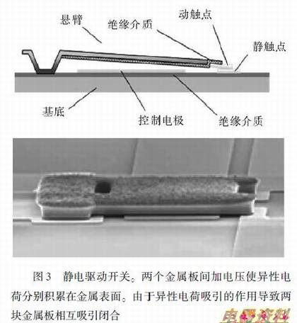 在两个金属板间加,使异性电荷分别积累在金属表面。由于异性电荷吸引的作用导致两块金属板相互吸引闭合(图3)。这种机制一般优势是结构和制作工艺相对简单,没有静态,因此,其功耗较小。缺点是所需驱动电压大(一般需要几十伏),动作位移小,所产生的作用力也相对较小。而且容易产生静电粘接(Stiction)。