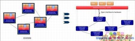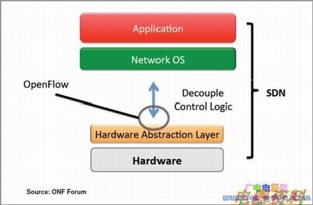 图1表达了SDN的分层解耦合概念,包括通用的基础硬件层、硬件抽象层、网络操作系统、上层应用。其中基础硬件与硬件抽象两层组成物理网络设备,也 就是SDN架构中的数据转发层面;网络操作系统与上层应用组成了控制层面。数据转发层面与控制层面之间以一种标准化的交互协议来解耦合,此协议当前为 OpenFlow。这种去耦合的架构,表明网络操作系统及网络应用(如路由控制协议等)不必运行在物理设备上,而可以运行在外部系统(如X86架构的服务 器)内,从而实现网络控制的灵活可编程性。