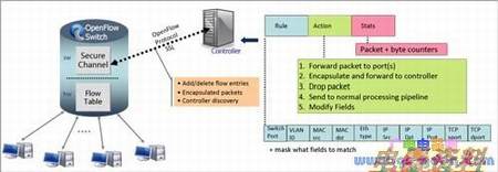 网络设备(图3中OpenFlowSwitch)由标准的网络硬件和支持OpenFlow代理的软件构成。OpenFlow定义的网络硬件,不是传 统的交换模式,而是以一种流表的方式来进行数据的转发处理,非常类似于当前交换机使用的TCAM对数据流的分类与控制行为,每一个网络中的流均由流表中的 规则来控制处理,可以达到极精细的粒度。OpenFlow协议定义了一种通用的数据平面描述语言,设备上的OpenFlow代理软件通过与 OpenFlow Controller建立安全加密(如SSL通信机制)通信隧道来接受对设备的控制转发指令。所有的流表指令均被定义成标准规范,通过 Controller与代理之间的加密协议可靠传递。Controller上运行的各种网络应用,均被转换成OpenFlow“指令集”下发,从而易于实 现标准化的模式,这使得OpenFlow成为SDN架构下的重要技术。