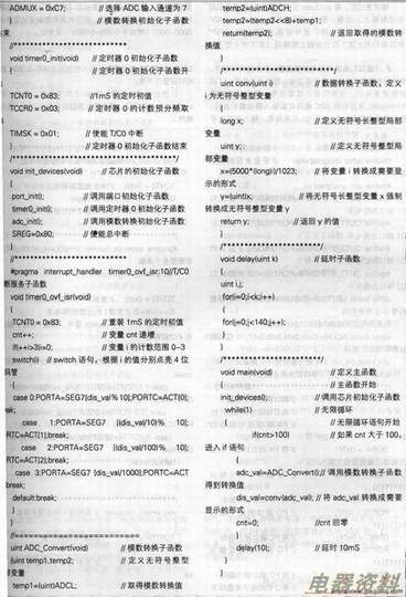 ATMEAG16L的模/数转换器编程实践1.简易数字式o~5v直流电压表实验用电位器RV1作模拟量的输入,右边4位显示输入电压值。我们使用PA端口的第7位进行模拟量输入,而PA端口的第O—6位作数码管的段驱动,这样,显示的数字中小数点不能被点亮。因此,“千”位数码管相当于显示整数,而“个”、“十”、“百”位数码管相当于显示小数,例如: