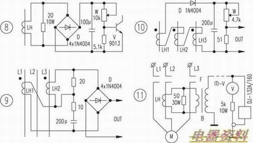 图10:是一种三次谐波电流,电机断相保护电路。因为三次谐波是位的,故也称作零序电流保护电路。电流互感器不是线性的,而是快速饱和的,所以铁心要使用铁氧磁环制作。