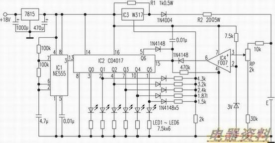 本装置如附图所示。IC1构成约1Hz的多谐,IC2构成脉冲频率6分配器,IC3构成充电执行电路。通电后IC2复位,Q0输出高,这时IC3输出电压仅1.25V,电路由+15V经R1给电池提供约10mA的充电电流。通电后IC1起振,其③脚输出的脉冲触发IC2工作,使输出端Q1~Q5依次出现高电平,经不同的分压分压后,IC3的输出电压按6V、7V、8V、9V、10V依次递增,充电电流也因此在70mA至270mA之间依次递增。当Q6输出高电平时IC2被复位,此后电路在IC1输出脉冲的作用下重复上述过程。