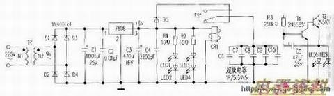 电路图见附图。该电路由7806直流稳压供电、照明、超级充放电及LED闪烁三部分组成。