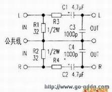 2.在电路中串入衰减电路,将信号强度降低,可以用如图所示电路。其中两声道必须用金属膜且阻值相同,误差不大于2%,C1、C2用胆电解或CBB电容,以保证音质,C3、C4用于滤除高频杂波。