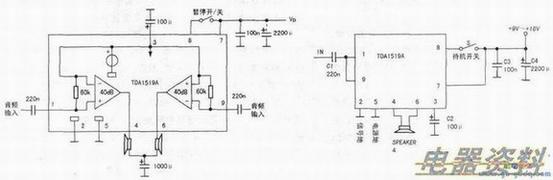 TDA1519A(8)脚的开关可用短路导线代替,TDA1519A(7)、(8)脚的要尽可能靠近引脚,TDA1519A的散热片要加大至长时间工作不烫手。采用上述方法代换了十多个板子,无一返修。