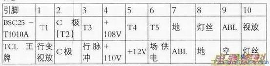 一台海尔高科的18英寸组装彩电,行幅缩小为正常的2/3,行变发热严重,显然是行变次级局部短路性损坏,其型号为BSC25-T1010A,引脚功能见下表。从一资料中发现TCL王牌废主板上的行变比较合适。去掉损坏的行变,接上一只100W灯泡作假,将主由108V调为110V,再将代换的行变装上去。据下表引脚功能对应接好。T1~T5是为调整行幅大小设计的,代换时可只接T2。TCL行变的③、⑤、⑥、⑨这四脚不用,可剪掉。